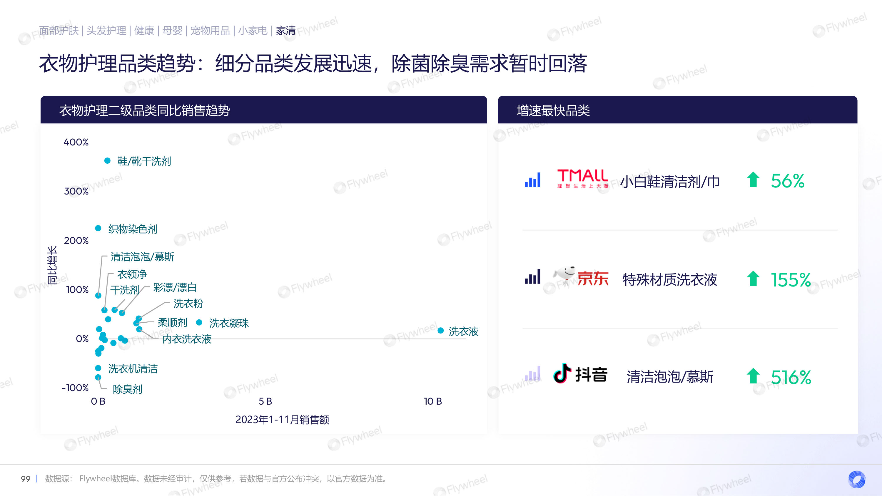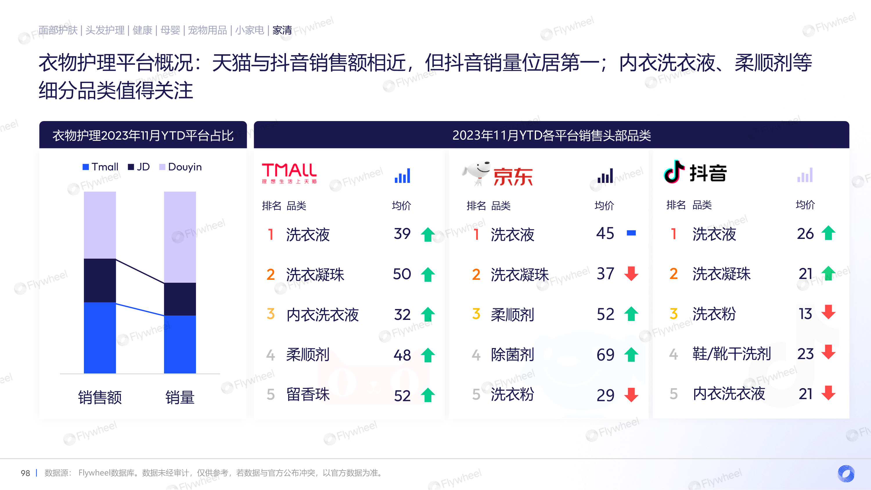 衣物护理品类中,天猫与抖音销售额相近,但抖音销量位居第一。细分品类发展迅速,除菌除臭需求暂时回落。