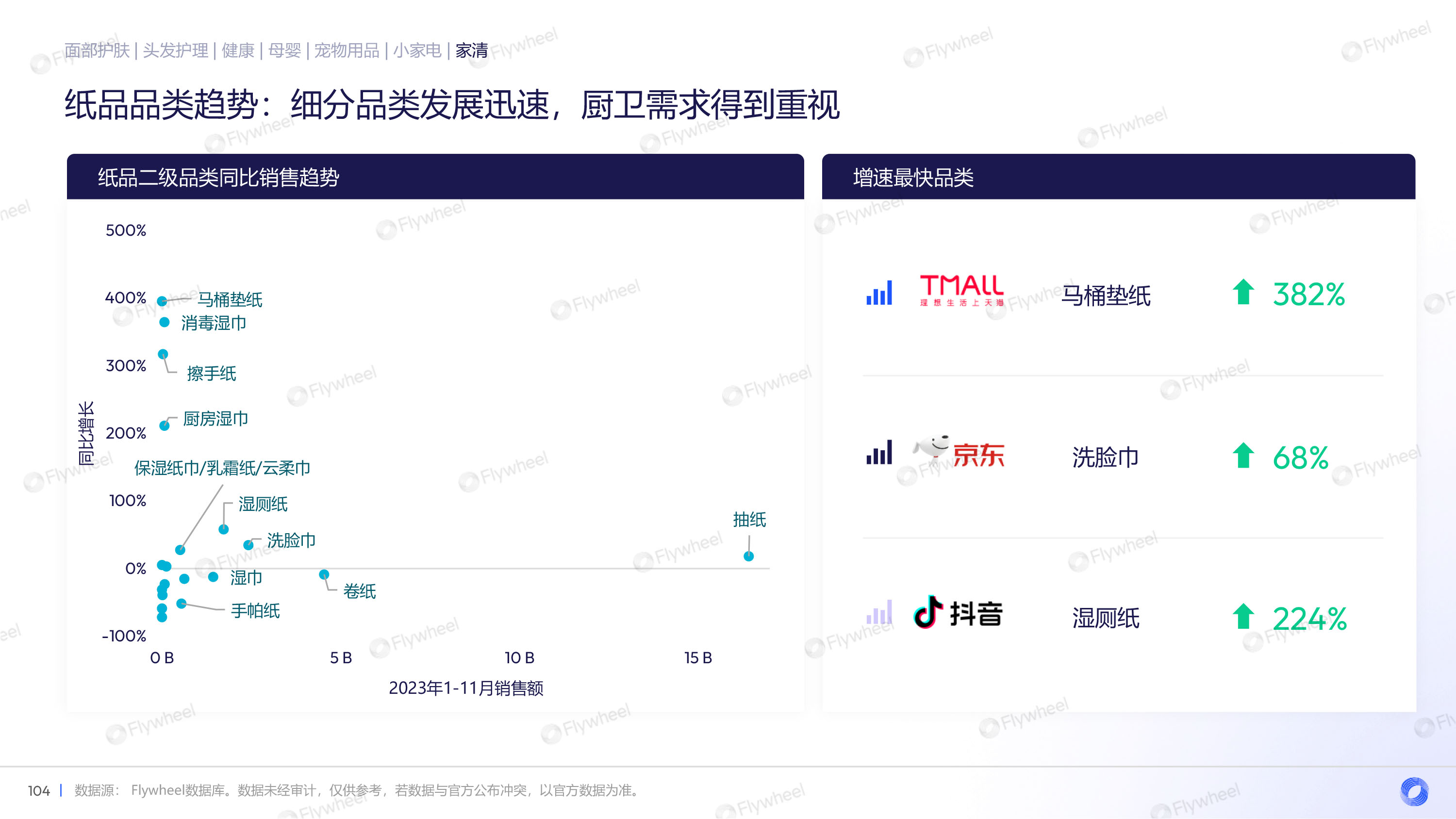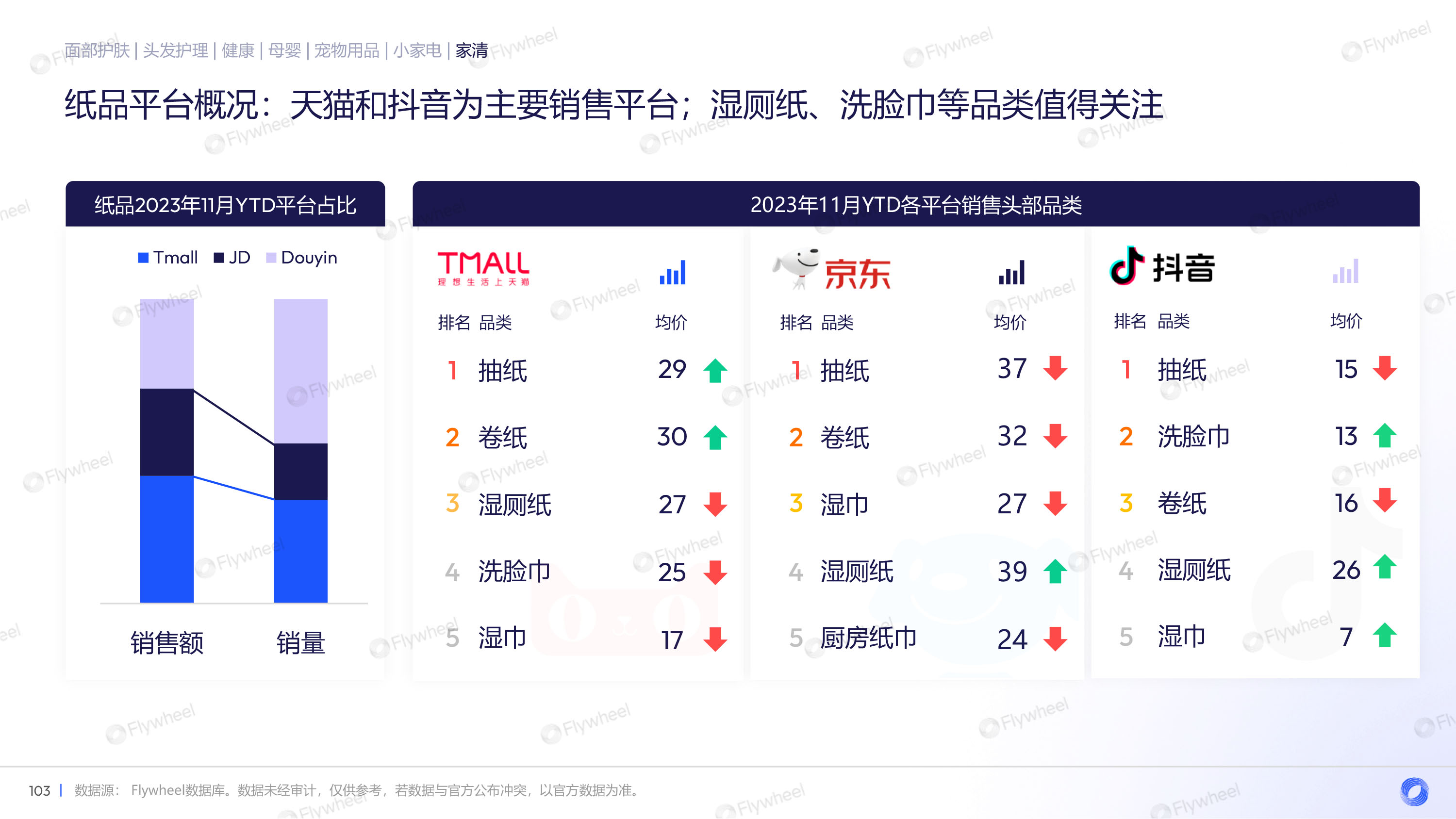 纸品相关品类中,天猫和抖音为主要销售平台,湿厕纸、洗脸巾等品类值得关注,厨卫相关用纸需求得到重视。