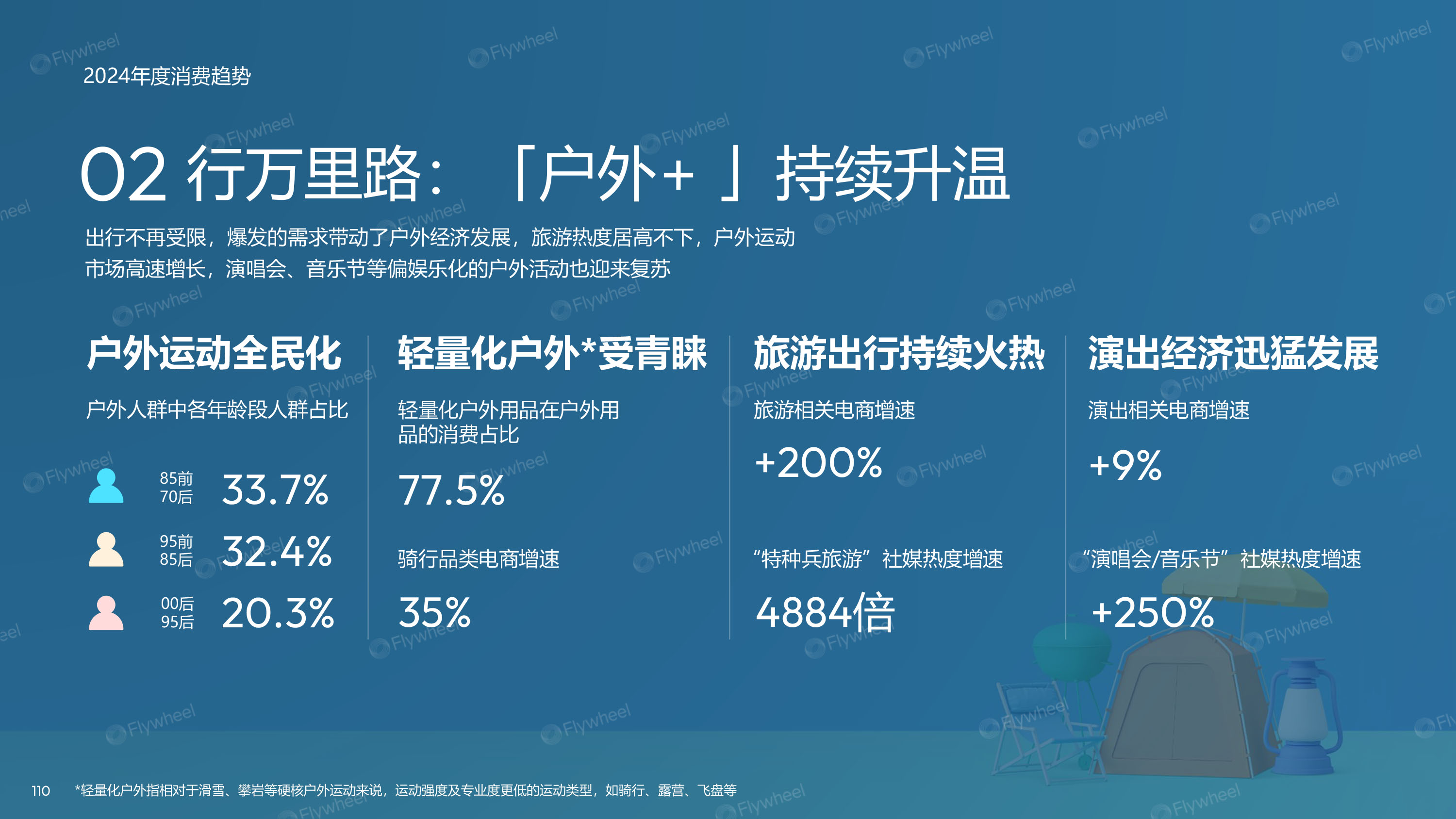 行万里路:「户外+ 」持续升温。出行不再受限,爆发的需求带动了户外经济发展,旅游热度居高不下,户外运动市场高速增长,演唱会、音乐节等偏娱乐化的户外活动也迎来复苏。