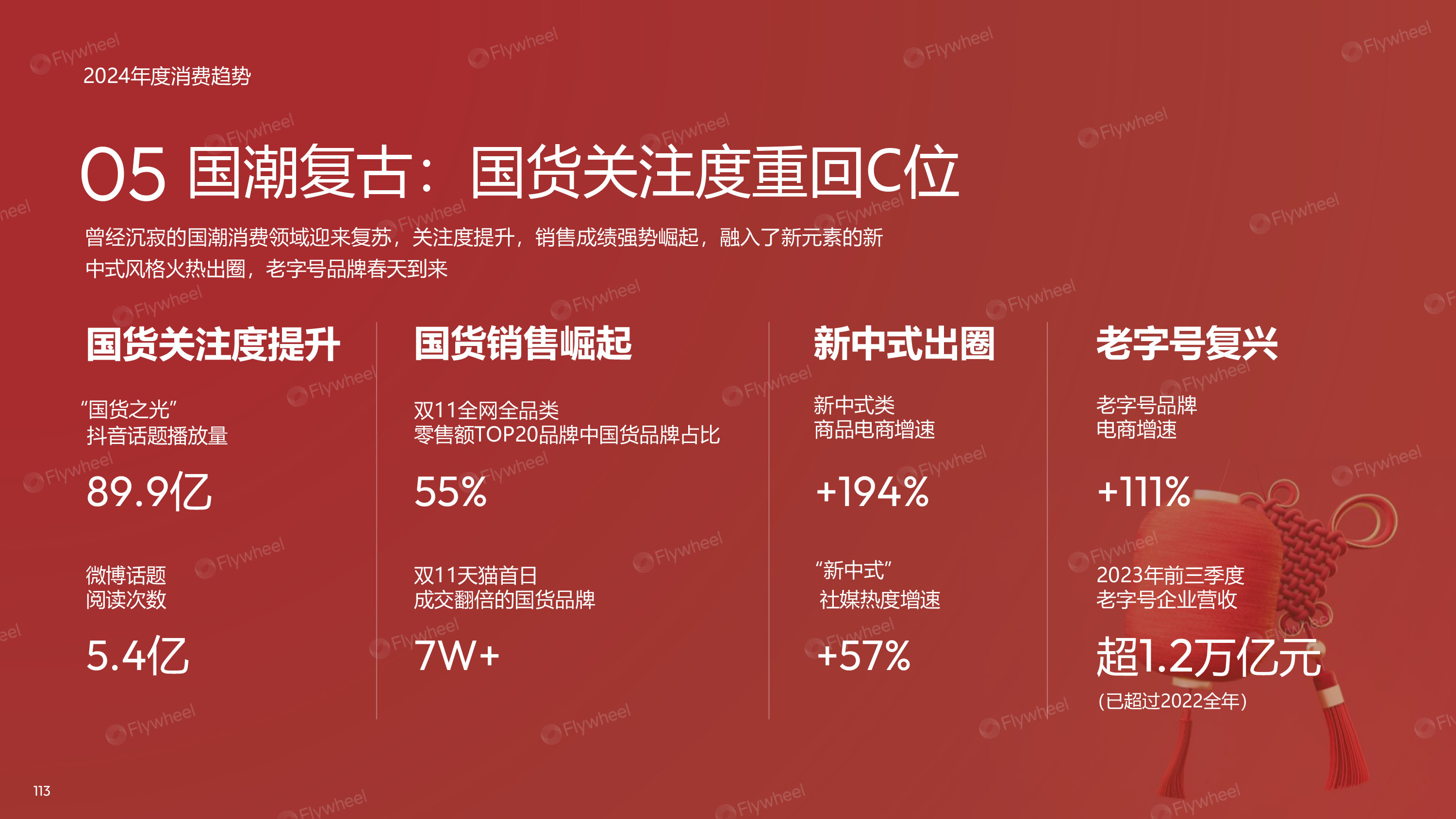 国潮复古:国货关注度重回C位。曾经沉寂的国潮消费领域迎来复苏,关注度提升,销售成绩强势崛起,融入了新元素的新中式风格火热出圈,老字号品牌春天到来。
