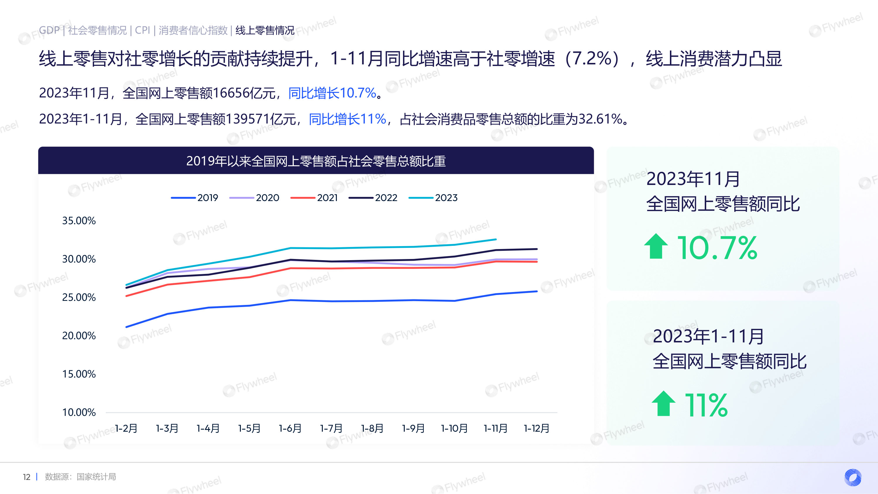 在过去的一年中,线上零售在社零增长方面发挥了重要作用。截至11月份,线上零售的同比增速高于社零增速,达到7.2%。尤其是食品、服装和日用品等商品在线上销售增速更快,超过了社零增速。这表明线上消费潜力日益凸显,线上零售在推动整体零售行业的发展中发挥着越来越重要的作用。