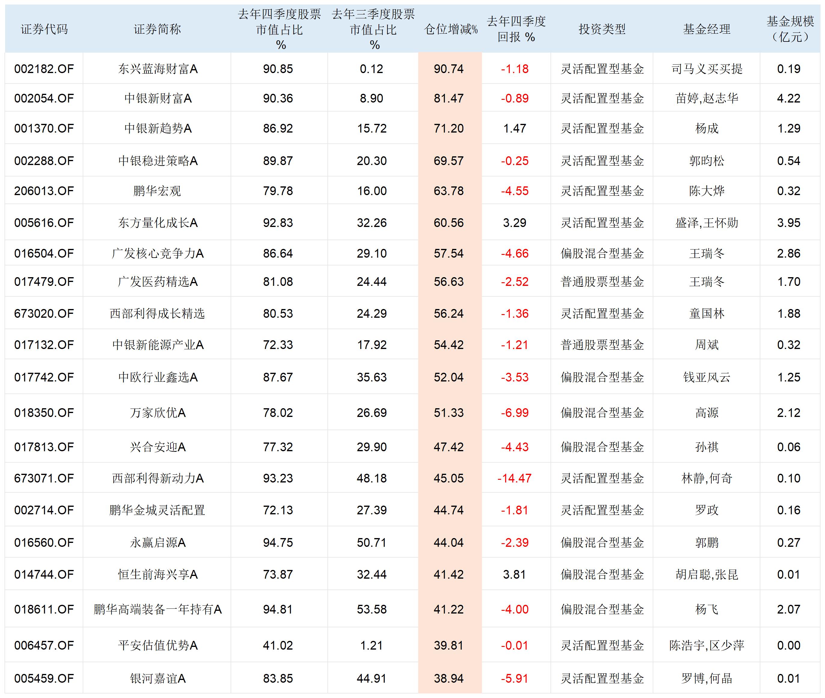 从具体的投资类型来看,灵活配置型基金因为持仓比例较为灵活,在去年四季度加仓幅度较大。以加仓幅度排在前20位的基金为例,就有9只灵活配置型基金。从规模来看,这些仓位调整较大的基金,规模均非常迷你,多在2亿元以下。