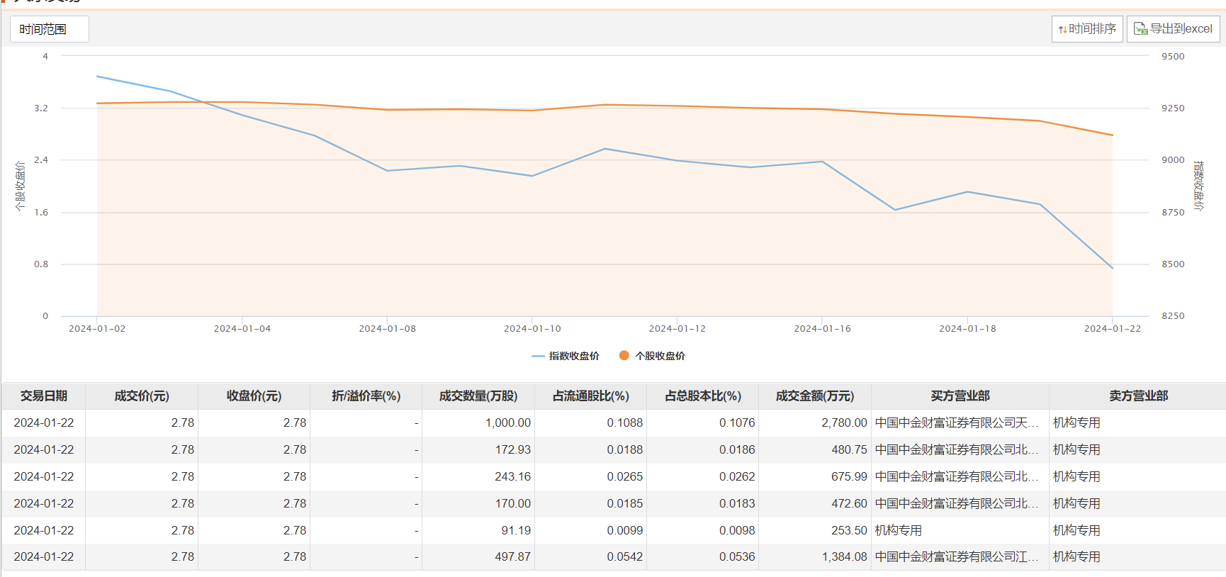 1月22日,钒钛股份今日大宗交易成交2175.15万股,成交额6046.92万元,占当日总成交额的9.71%,成交价2.78元,较市场收盘价持平。