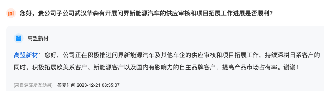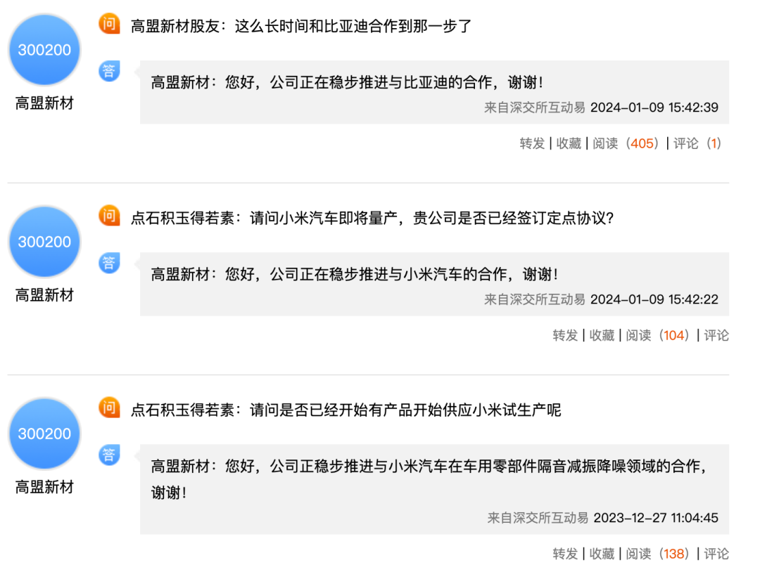 不过高盟新材最近一直在寻求业务的突破,正在积极拓展新能源汽车客户。如今年以来,高盟新材多次在互动平台回复投资者关于公司与新能源汽车合作的问题,包括“正稳步推进与小米汽车在车用零部件隔音减振降噪领域的合作”“正在稳步推进与比亚迪的合作”“正在积极推进问界新能源汽车及其他车企的供应审核和项目拓展工作,持续深耕日系客户的同时,积极拓展欧美系客户、新能源客户以及国内有影响力的自主品牌客户,提高产品市场占有率。”等等。