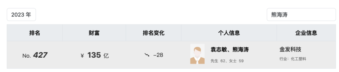 2006年,袁志敏与熊海涛夫妻就曾共同登陆《胡润百富榜》,以16亿财富值位列榜单第203位。此后至今,二人多次登陆富豪榜,2023年,二人财富值已到135亿元,位列《胡润百富榜》第427位。