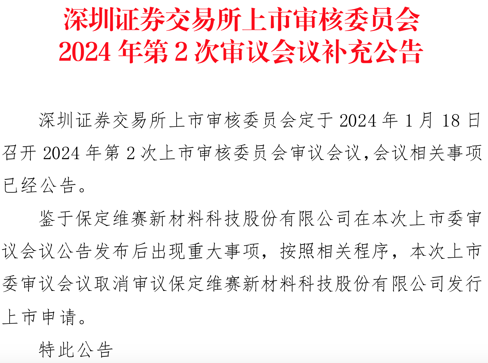 原本计划在1月18日上会的保定维赛新材料科技股份有限公司(下称维赛新材),因在上市委审议会议公告发布后出现重大事项,按照相关程序,上市委审议会议取消审议维赛新材的首发申请。