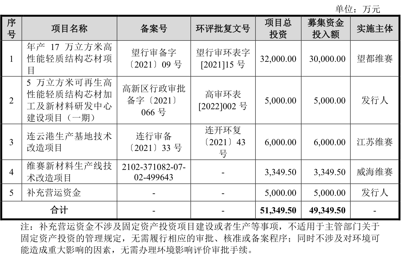 招股说明书显示,维赛新材主要从事高性能结构泡沫材料的研发、生产与销售,核心产品包括PVC结构泡沫、PET结构泡沫等。维赛新材已与中材叶片、中复连众、三一重能、中科宇能、明阳智能、远景能源等国内风电行业知名厂商建立了长期稳定合作关系;并已通过LM风能母公司GE安环审核,对LM风能实现批量供货,系LM风能结构泡沫材料国内唯一内资供应商。公司拥有授权发明专利8项、实用新型专利65项。