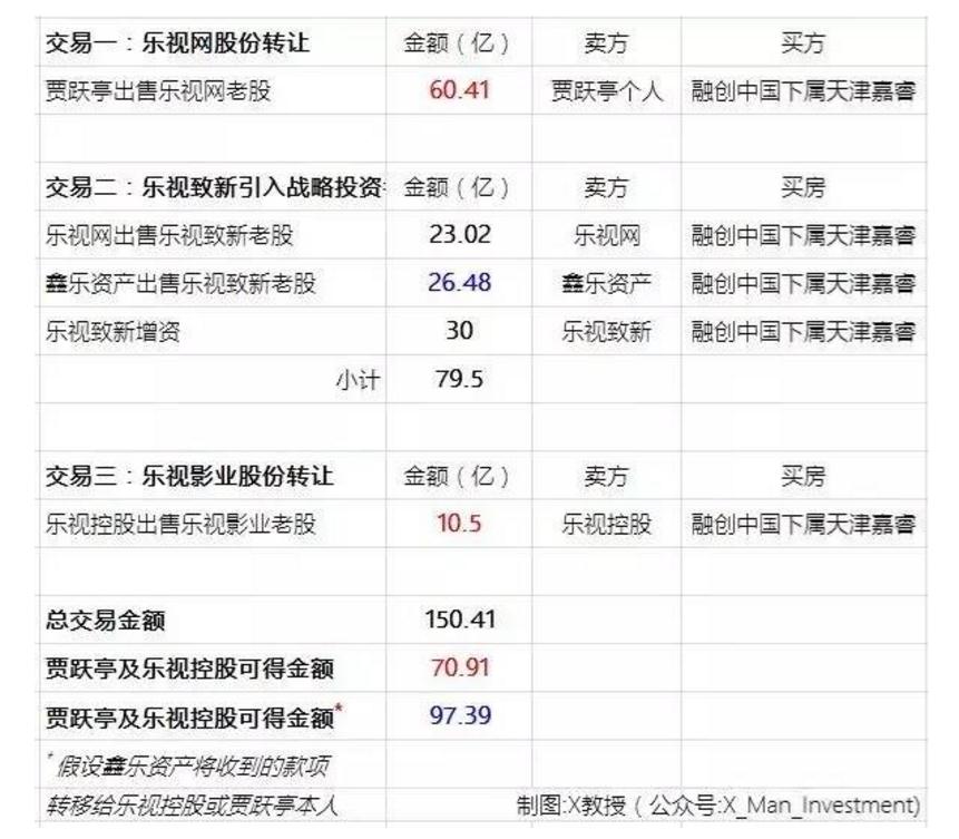 由于融创和乐视有三笔交易,并且牵涉到老股转让和增资,X教授整理了三笔交易的详情,将贾跃亭和乐视控股可以收到的金额分析完之后,可见这两者可以收到的交易对价是70.91亿(红色数字)。由于鑫乐资产是员工持股平台,假设贾跃亭个人可以100%控制这个平台并享受所有利益,那他可以得到的资金为97.39亿(蓝色数字)。不论是那种情况,扣除贾跃亭赎回股份需偿还的贷款后,最好的情况还能剩三十多亿(97.39亿-65.52亿),最坏的情况还有14亿的缺口(70.91亿-83.95亿)。