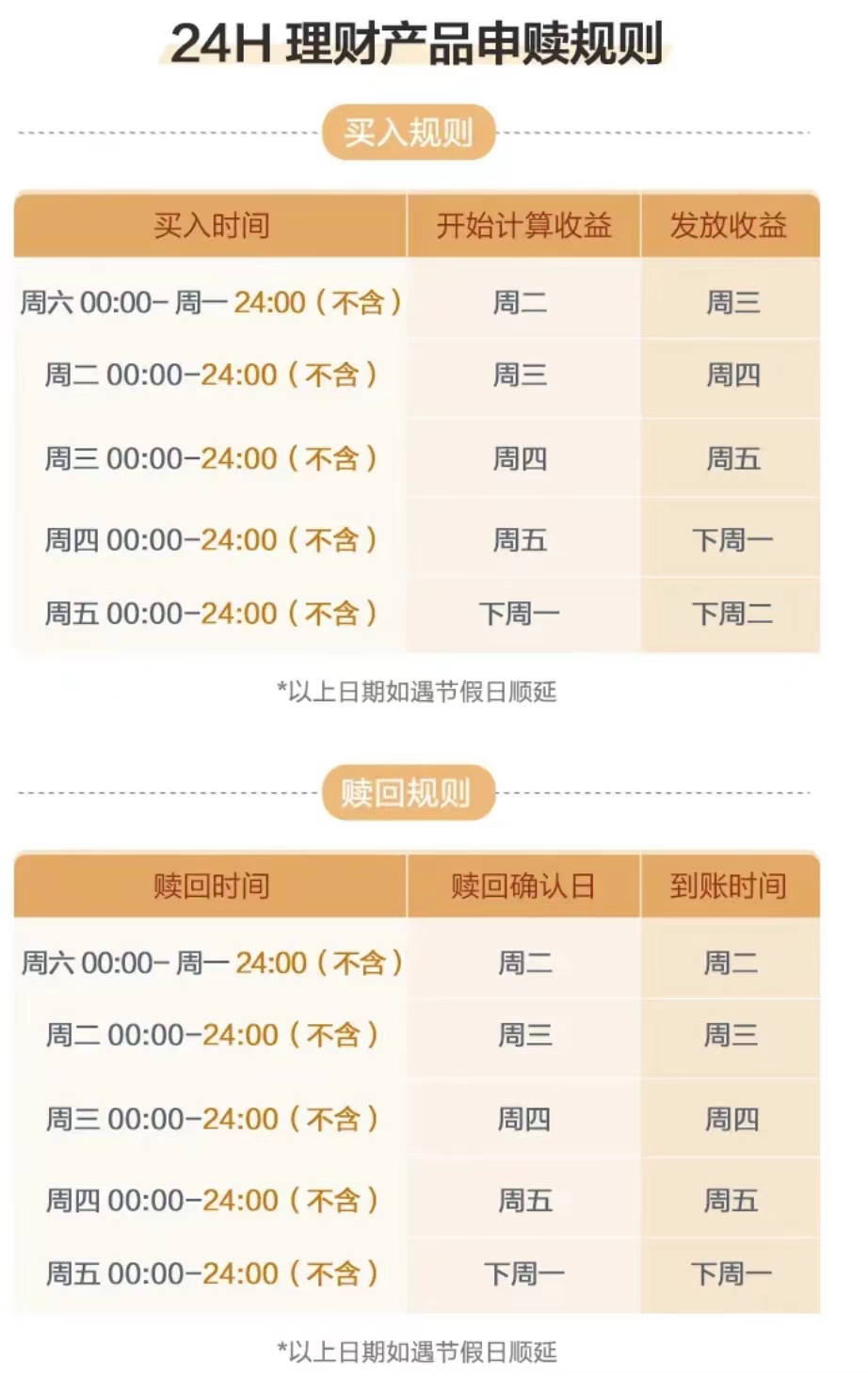 也就是说,如果当天17:00之前买入,可以在第二天确认,在当天17:00之后则要再等一天,如果遇到节假日,等待确认的时间则会更长。现在则突破了这一限制,将营业时间延长至交易日的24:00前。工作日17:00-24:00(不含)申购,也于下一个工作日开始计算收益,比普通理财产品早一天开始享收益。如在周四17:00-24:00(不含),则可比普通理财产品早三天开始享收益。