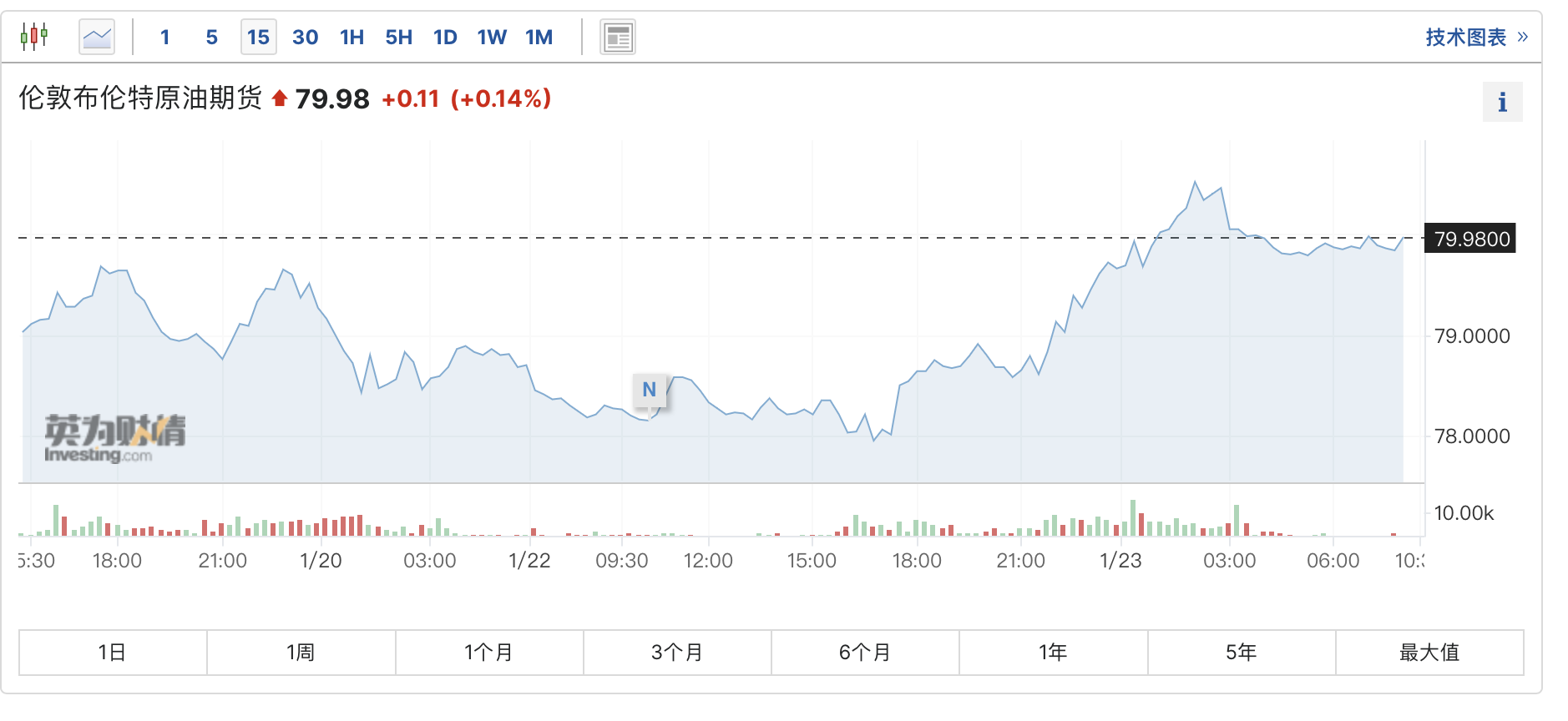 英为财情数据显示,1月22日-23日,布伦特原油3月期货价格连续两日最高突破80美元/桶。截至发稿前价格为79.98美元/桶,涨幅0.14%,相比1月2日上涨约5.4%。