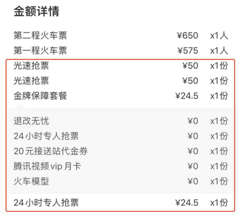 再仔细看看,由于她选定的是两段车程,付给平台的“抢票费”也付了双份。
