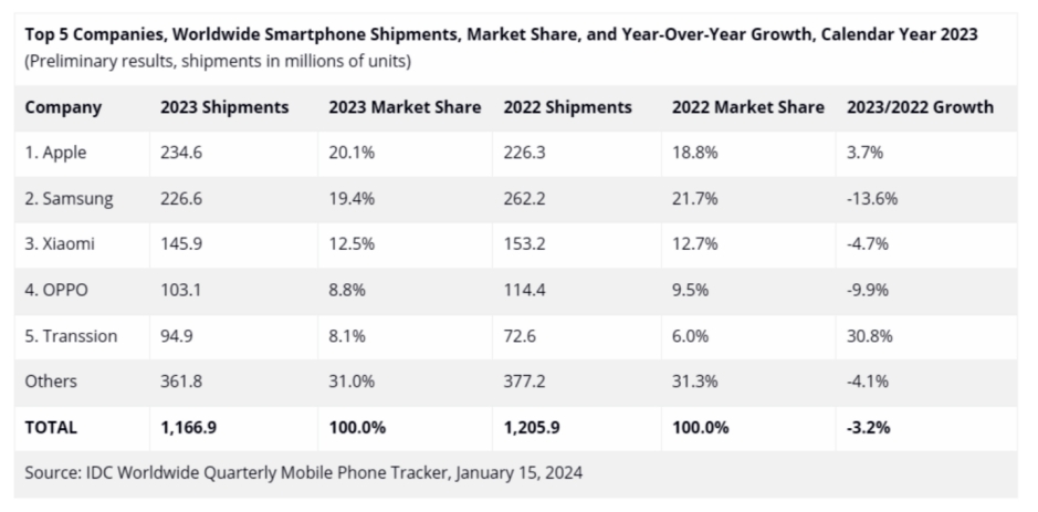 紧随其后的是三星和小米。三星的出货量为2.27亿部,同比减少13.6%,以19.4%的市占率排名第二;而小米则以12.5%的市占率排名第三,出货量为1.46亿部,同比减少4.7%。