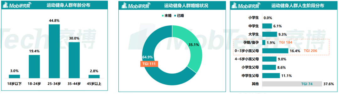 而具体拆解健身主力人群的画像分析,我们可以看到,需要兼顾家庭、工作以及健身的中青年职场人群居多。据Mob研究院调查,在中国的健身人群中,25-44岁占据了超过7成的比例,中青年人扛起了运动健身的主力大旗。在此之中,已婚人群占据了超6成的占比,近一半的健身人群承担着父母的身份。