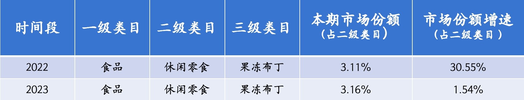 在对2023年消费品市场的回顾与复盘中,一个“量价齐升”的休闲零食类目引起了我们的注意。在2023年休闲零食类目同比小幅下滑的背景下,“果冻/布丁”这一类目在2022年、2023年在休闲零食类目中的占比均有同比上涨。