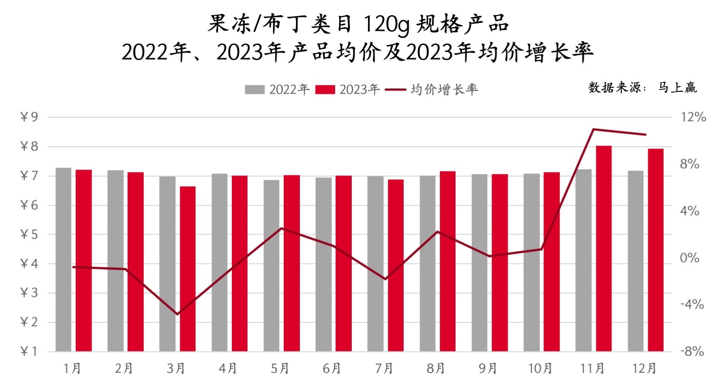 基于马上赢线下零售监测网络中的相关数据,果冻/布丁类目内较有代表意义的120g规格产品的均价增长率在全年大部分时间也均为正,且在第四季度迎来了一波上扬。