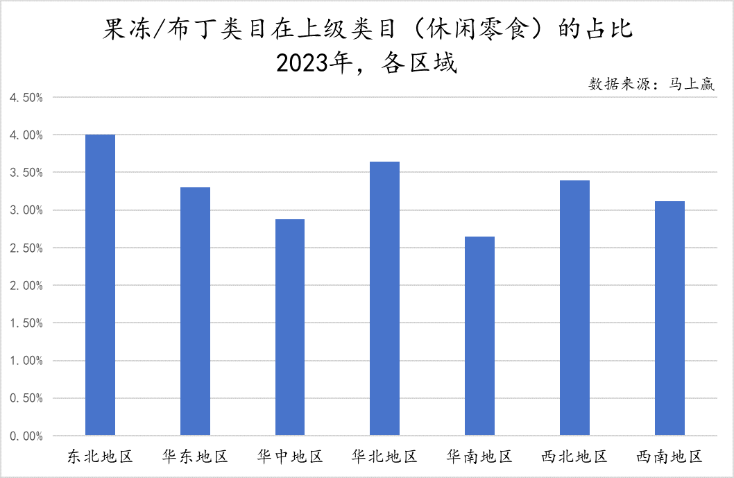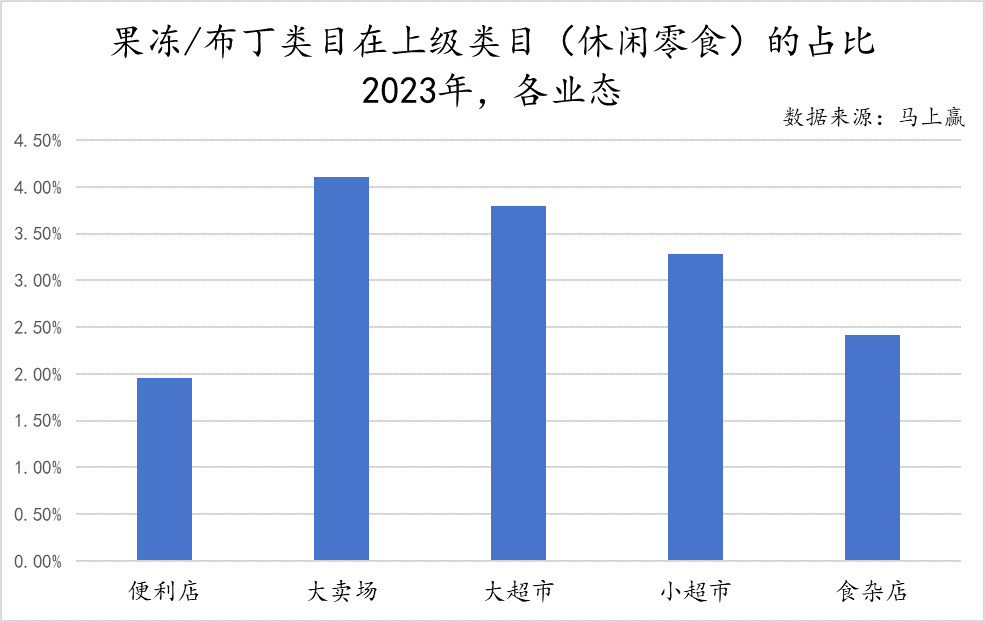 类目在各业态中的上级类目消费占比上,可以看到在大卖场、大超市等典型大业态中,果冻/布丁类目在上级类目中的占比显著偏高,可见以家庭采购为主要消费动机的大业态在与果冻/布丁的典型消费场景契合度更高。相比来说,在便利店的休闲零食消费中,果冻/布丁类目的产品消费偏低,其占比相较大卖场中的占比低了近一倍。