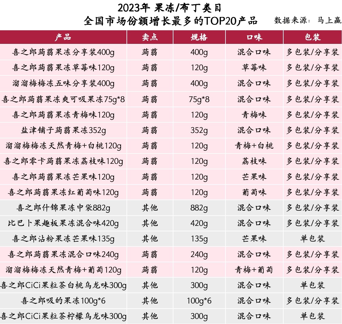在年度快速成长新品的观察中,我们拉取了2023年果冻布丁类目内市场份额增长最快的Top20 SKU,并基于卖点、规格、口味、包装形式进行了分类。可以看到,在该Top20的产品中,有14款产品是以蒟蒻为核心卖点。在2023年的果冻/布丁类目新品中,“蒟蒻”类产品已经成为了名副其实的增长发动机。