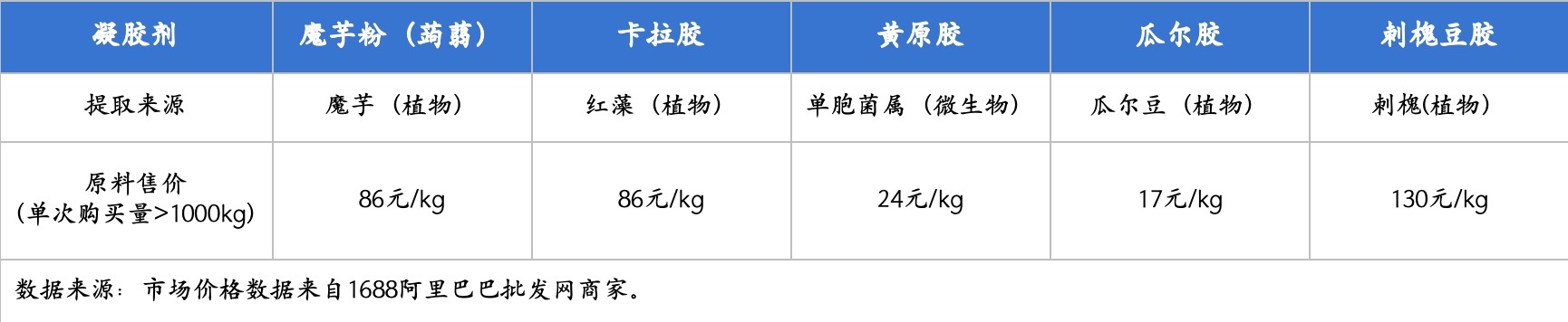 这些凝胶剂尽管被称为“胶”,但其实大都来自于天然动植物和微生物原料,并通过干燥提纯、微生物发酵或动物胶原蛋白提纯等制备方式获得。虽然凝胶剂的成本有所不同,但它们大多都具备热量低、提供饱腹感、加速肠胃蠕动的功效特点。