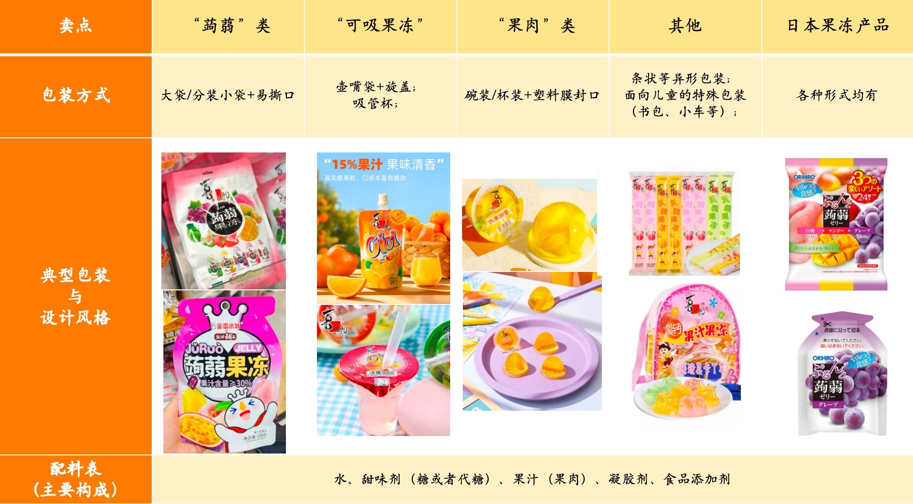 - 记忆中的杯装、碗装果冻产品sku很少(<20%),大袋分装小袋包装形式的产品占大多数(>50%),可吸果冻占一部分(≈30%);