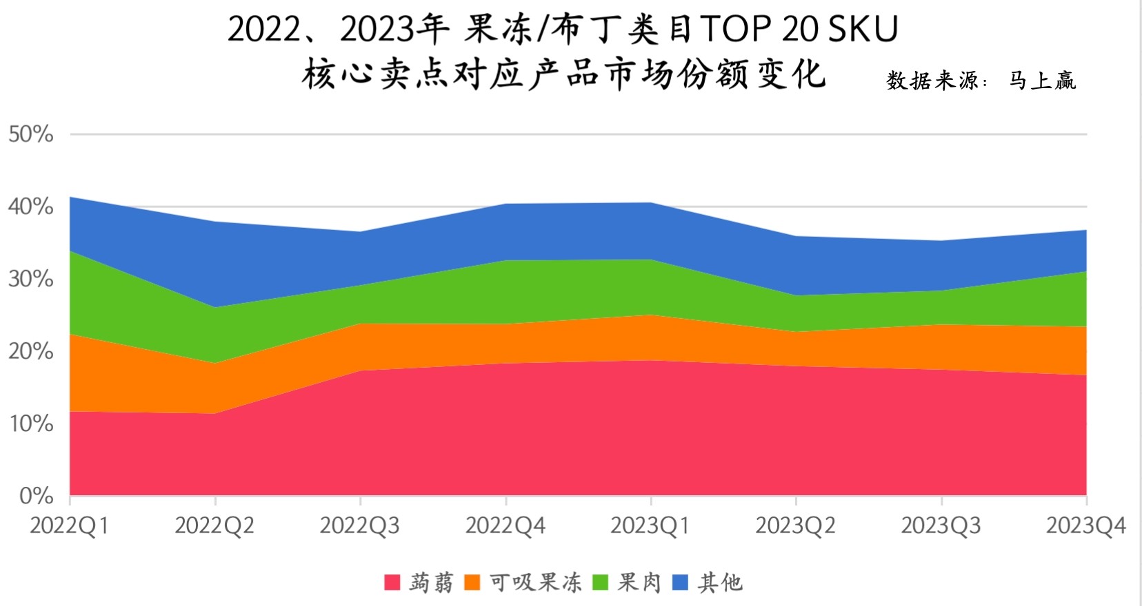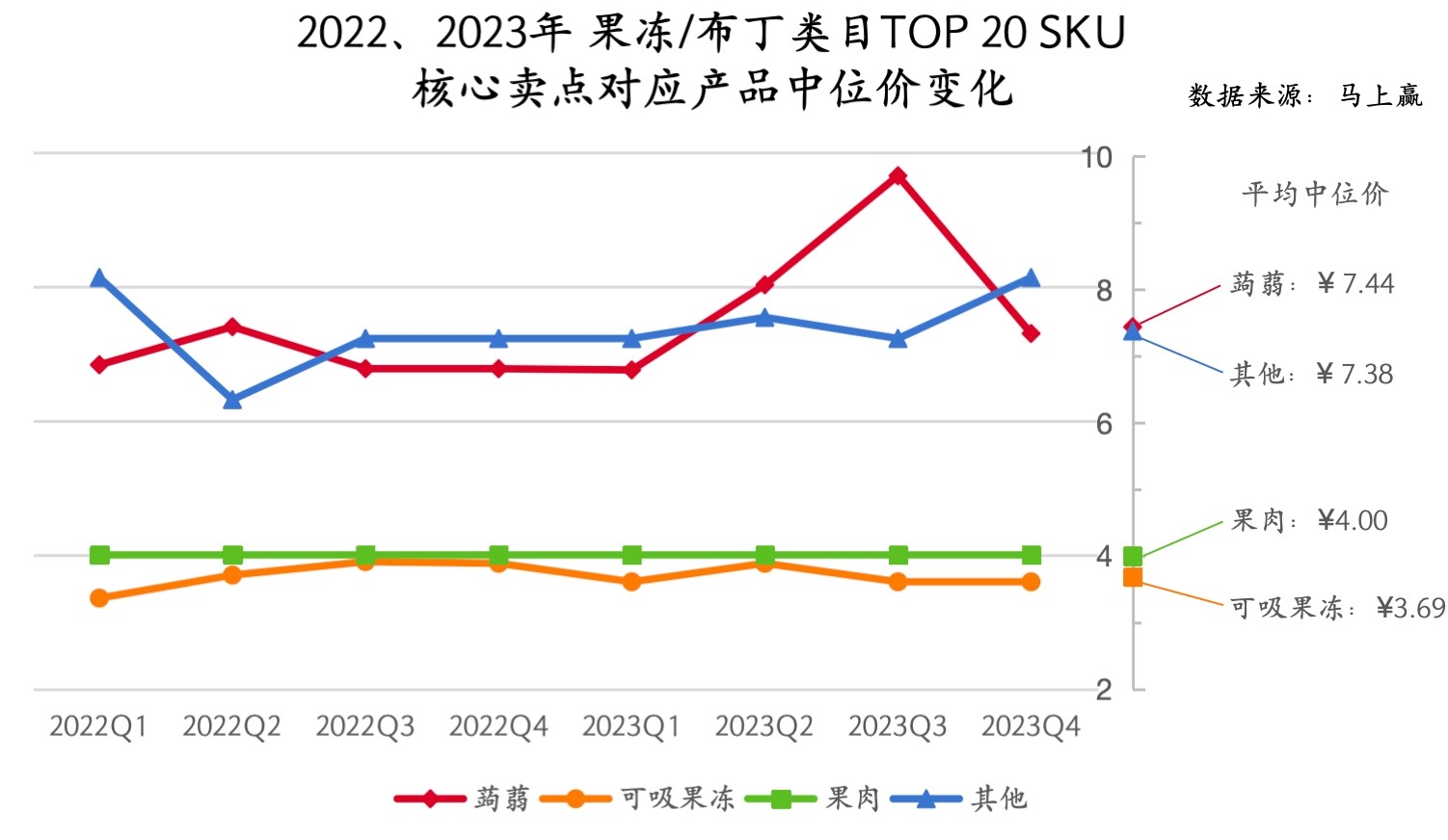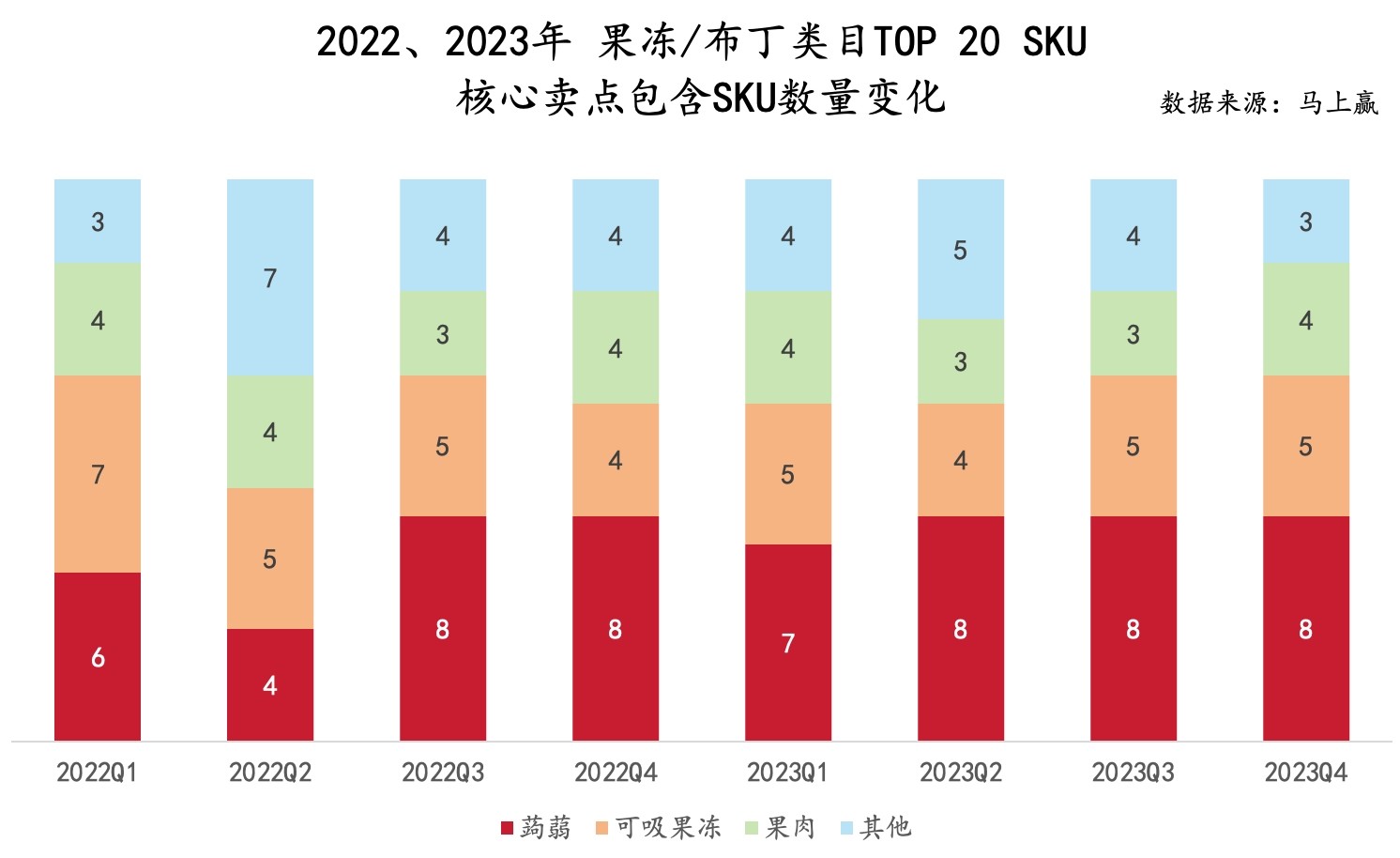 为了更清晰的看到“蒟蒻”风何时在类目中刮起,基于马上赢线下零售监测网络中的相关数据,我们拉取了2022、2023两年Q1-Q4共8个季度,果冻/布丁类目内的销售TOP20产品,并通过分析类目内各个卖点包含的SKU数量、各卖点产品中位价、各卖点下产品所占市场份额变动情况等维度对“蒟蒻”这一概念进行进一步的分析。