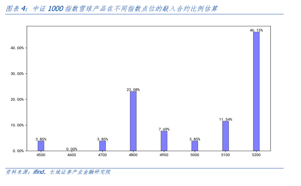 另据长城证券1月22日研报分析,从敲入点位分析,目前挂钩中证1000的雪球产品会在指数下跌至5200点以下时开始发生敲入,集中敲入区间在5200点以下,平均每下跌100点,敲入13%左右的存续产品,而雪球产品在5200点左右的敲入速度达到顶峰,46%左右的存续产品的敲入位置集中在这个区间。根据1月19日的中证1000指数来看,挂钩中证1000的雪球产品即将进入敲入顶峰区间。