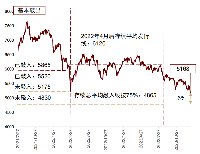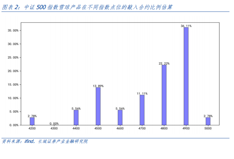 挂钩中证500的雪球产品方面,据长城证券测算,对应雪球产品会在指数下跌至5000点以下时开始发生敲入,集中敲入区间在4900点以下,平均每下跌100点,敲入36.11%左右的存续产品。根据1月19日的中证500指数来看,挂钩中证500的雪球产品即将进入集中敲入区间,存在2.78%的缓冲区间。