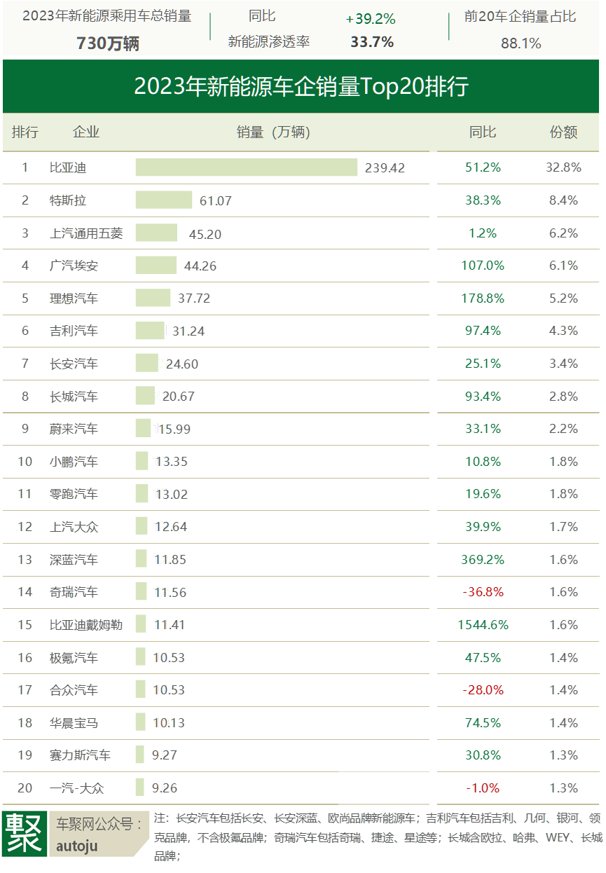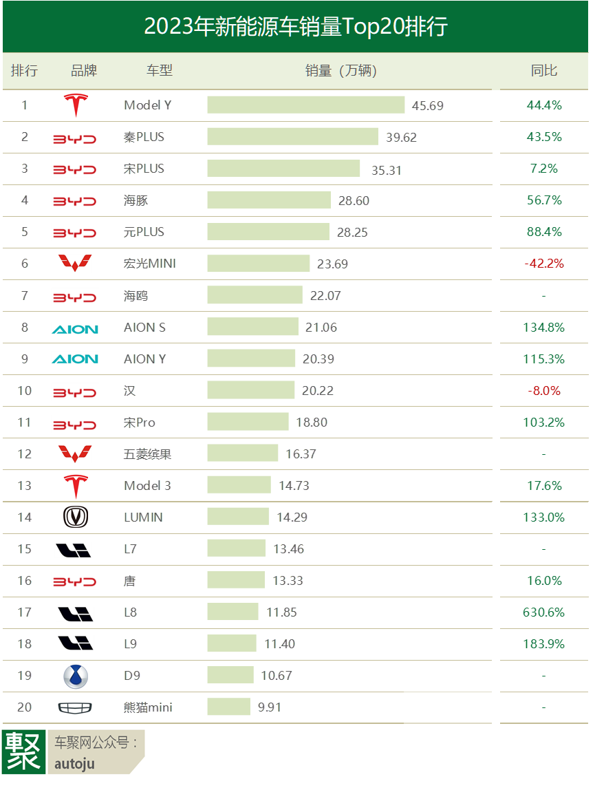 下面再看看2023年新能源车型榜,TOP20基本被前五车企包揽。