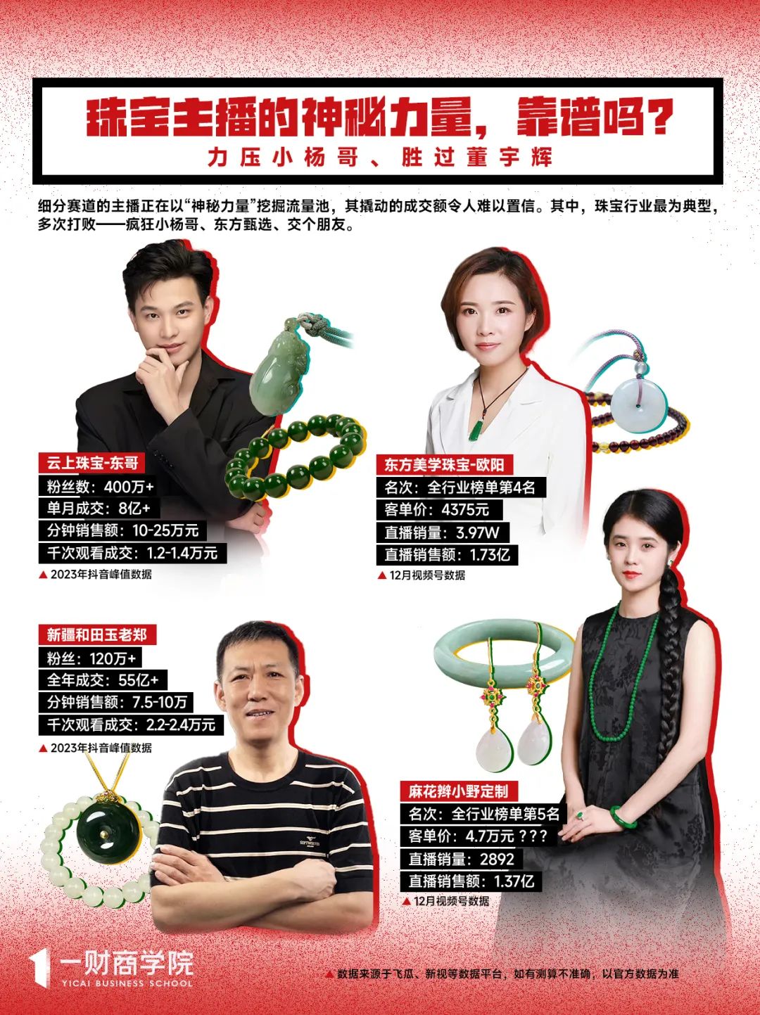 2023年的抖音电商达人带货月榜上,“新疆和田玉老郑”有9个月都处于前3名,其中2个月登顶,多次打败3大百亿直播集团——疯狂小杨哥、东方甄选、交个朋友。