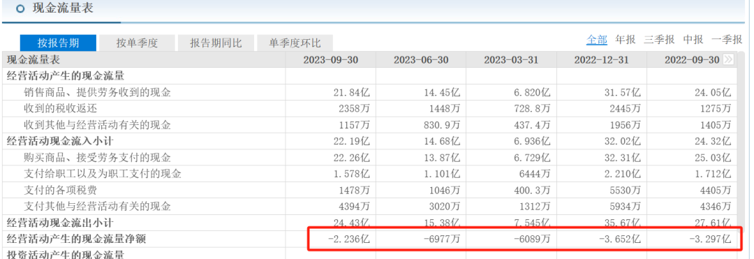 至2023年第三季度为止,7年中共28个单季度财务数据中,只有2018年3个季度、2019年2个季度、2021年2个季度合计7个季度的数据为正,其余均为负数,即经营活动的支出现金大于流入现金。