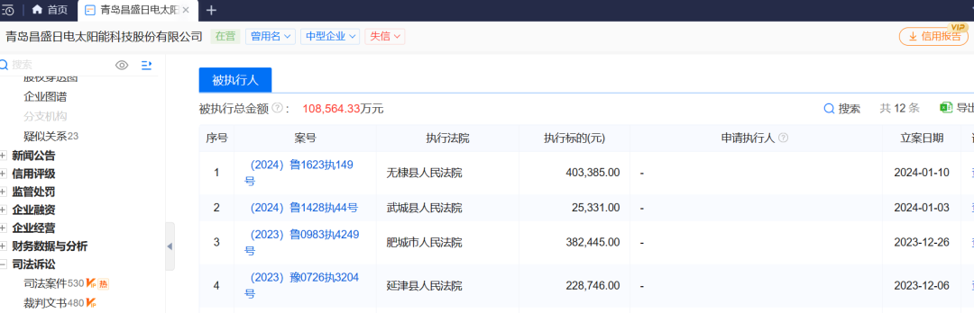 昌盛日电持有的美达股份全部处于质押和冻结状态,该公司更有17条失信被执行人信息。2023年至今,昌盛日电已有12次被执行人信息,被执行总金额约10.86亿元。