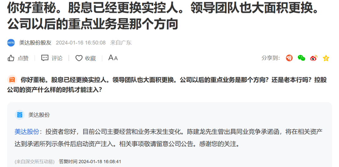 1月18日,美达股份董秘回复投资人咨询时表示,陈建龙已经出具同业竞争承诺函,将在相关资产达到承诺所列示条件后启动资产注入。