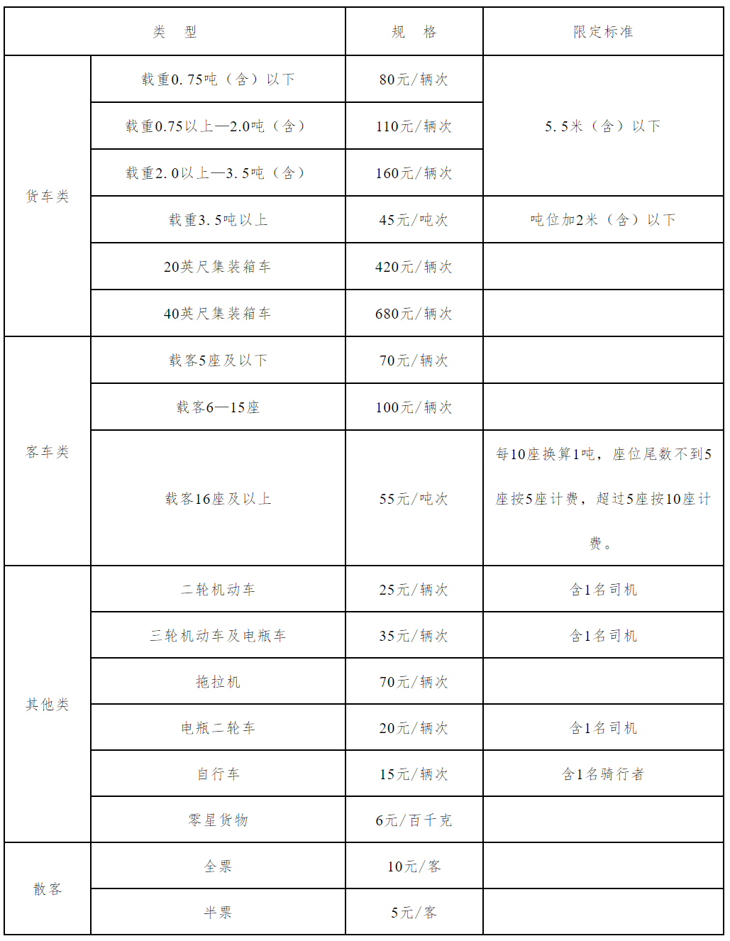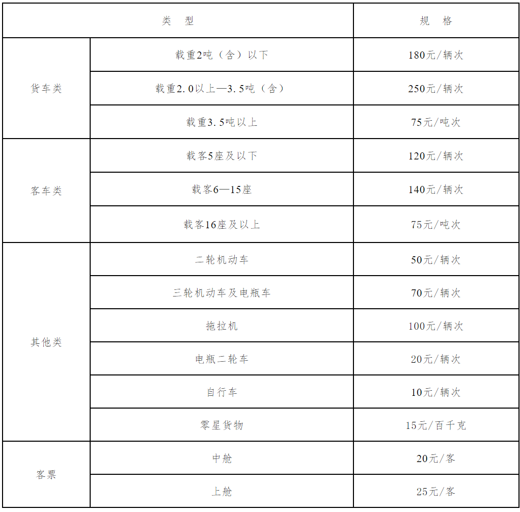 (2)车辆收费实行车客分流按实计收,除自行车、电瓶自行车外,每辆车随带一名驾驶员。