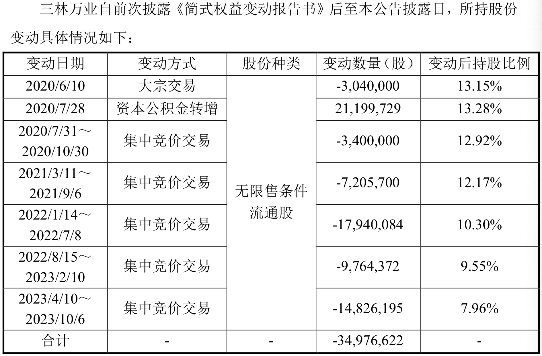 公告显示,2020年6月,三林万业通过大宗交易减持304万股(占当时总股本的0.38%)后降至13.15%,接着2020年7月三林万业持股因资本公积金转增增加2119.97万股,持股比例增至13.28%,此后三林万业一路减持,至2023年10月持股比例为7.96%,即仅2020年7月至2023年10月,三林万业减持比例就达5.32%。