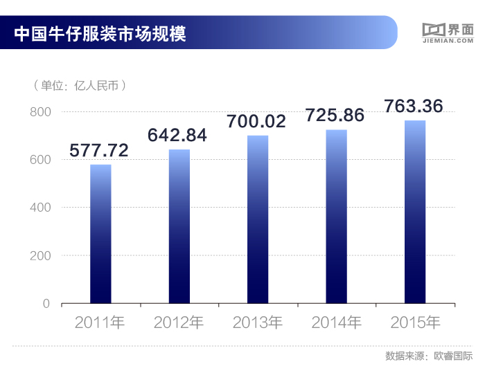 时至今日,牛仔服装在中国已经说不上是一个多大的潮流,它更像是必备品,和每个人衣橱里一定会有T恤一样。根据咨询公司欧睿国际提供的数据,最近5年,中国牛仔服装市场销售总量依旧保持增长,从2011年时的577.72亿元人民币上涨至2015年底的763.36亿元。