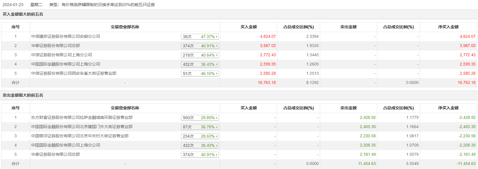 具体来看,知名游资现身龙虎榜,方新侠(中信证券股份有限公司西安朱雀大街证券营业部)净买入2580.28万元。此外,中信建投证券安徽分公司、华泰证券总部分别买入4824.07万元、3987.05万元;东方财富证券拉萨金融城南环路证券营业部、中国国际金融北京建国门外大街证券营业部分别卖出2428.92万元、2405.30万元。