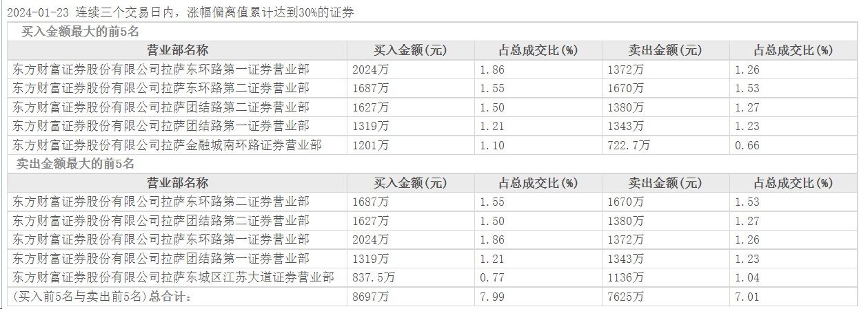 游资、散户聚集地 “拉萨天团”近期扎堆参与*ST左江炒作。1月23日(三日)龙虎榜显示,东方财富证券位于拉萨的多个营业部完全占据了买入及卖出前五席位,合计买入8697万元并卖出7625万元。
