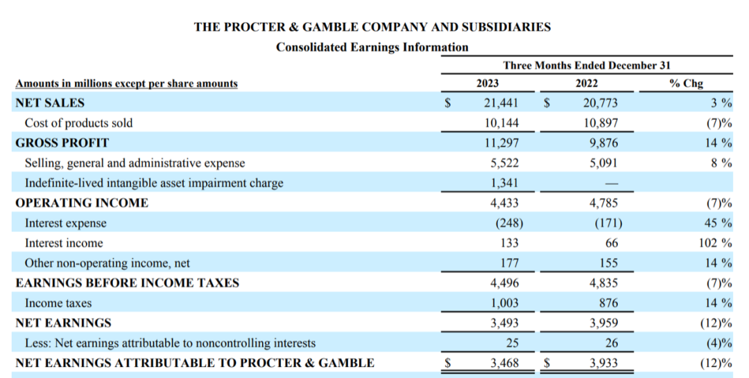 1月23日,宝洁发布了2024财年第二季度(2023年9—12月)财报。财报显示,期内,宝洁净销售额为214亿美元(约合人民币1541.61亿元),同比增长3%;归母净利润同比下滑11.8%至34.68亿美元(约合人民币249.83亿元)。