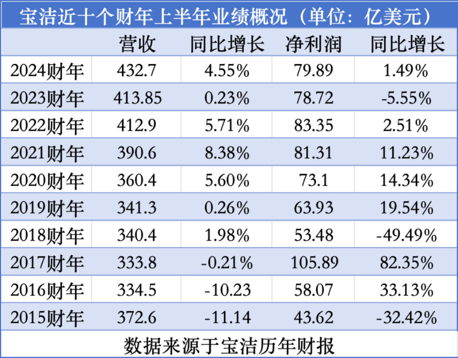 结合此前发布的2024财年第一季度业绩来看,2024财年上半年(2023年7—12月),宝洁营收共录得432.7亿美元(约合人民币3117.08亿元),同比增长4.55%;净利润录得79.89亿元(约合人民币575.51),同比微增1.49%。