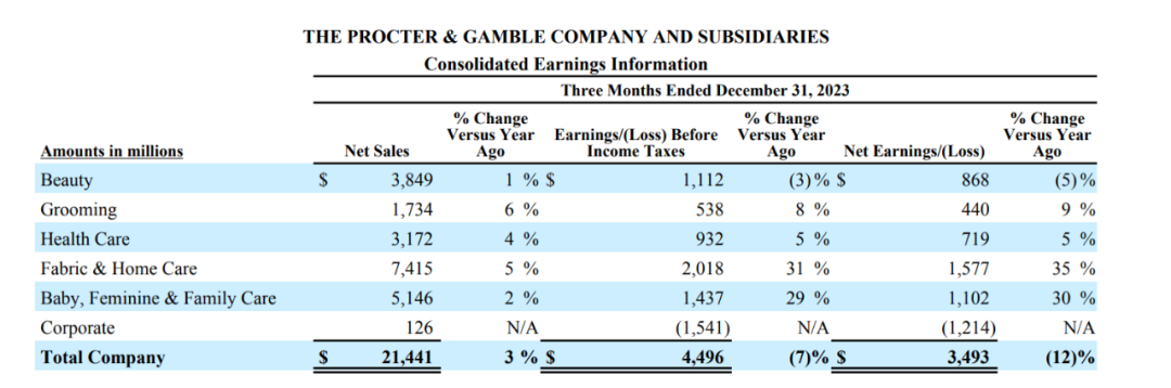 在此次发布的财报中,宝洁详细拆分了旗下五大部门在2024财年第二季度中的表现。