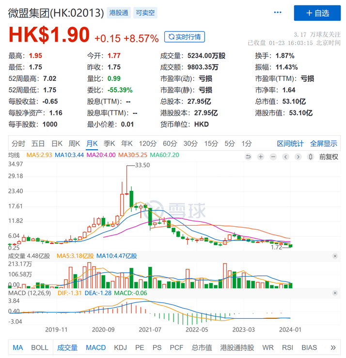 在股价达到最高位后,微盟股价一路下滑,截至1月23日收盘,微盟集团港股股价报1.9港元/股,较发行价已跌去近40%。