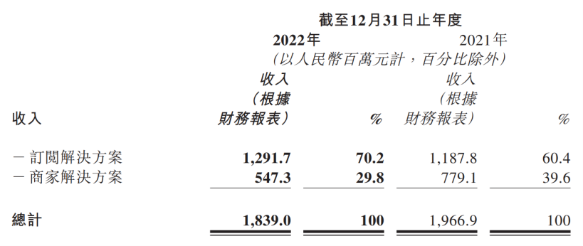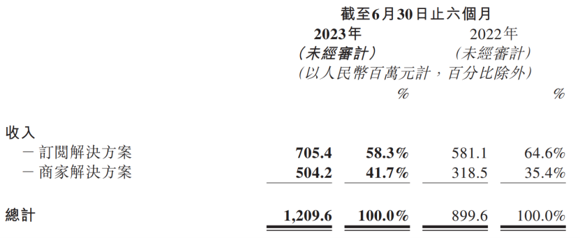 2023年上半年,广告、营销等在内的商家解决方案,收入达到5.04亿,占比41.7%;商业及营销SaaS产品以及ERP解决方案在内的订阅解决方案,收入达到7.05亿,占比58.3%。而在2022年年报中,二者的收入还是三七开。