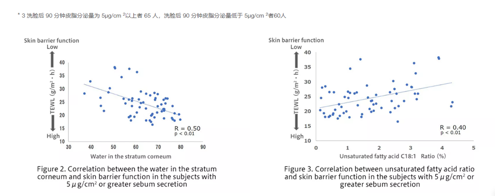 结果发现,高比例的不饱和脂肪酸可能导致皮肤屏障功能降低和角质层含水量减少,而皮脂分泌较少的受试者组没有表现出这种相关性。这表明,影响皮肤屏障功能的不仅是皮脂的量,而且是皮脂质量(即不饱和脂肪酸的比例),并且,通过降低角质层的含水量可以对皮肤产生负面影响。