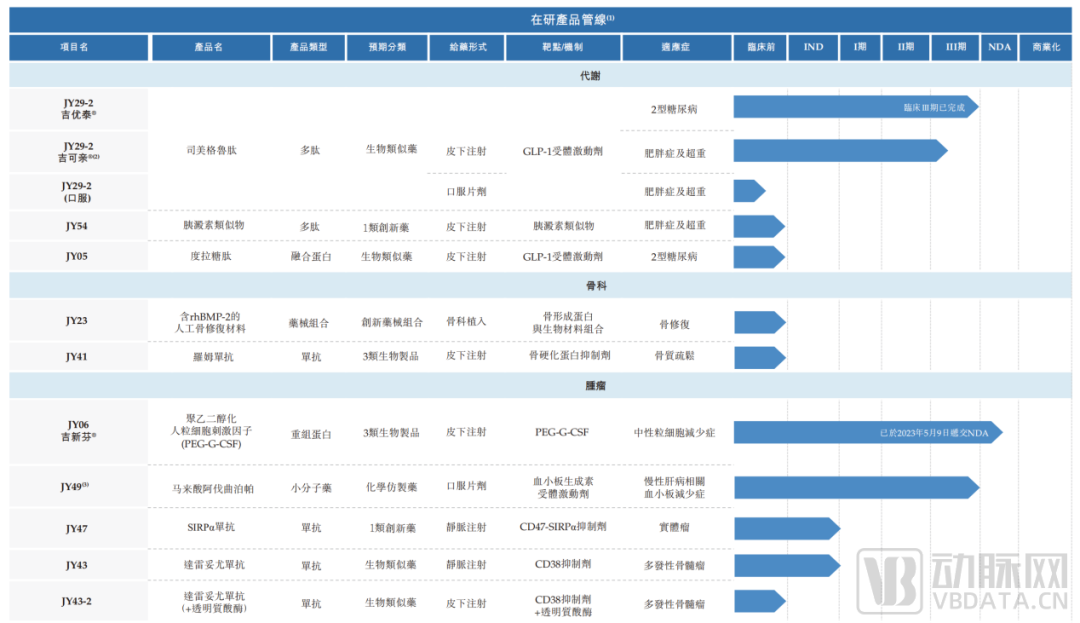 ● JY43及JY43-2分别为达雷妥尤单抗静脉注射剂及达雷妥尤单抗皮下注射剂的生物类似药。两款药物均用于治疗多发性骨髓瘤,该产品于2023年4月获得JY43的IND批准,现正对JY43-2进行临床前研究。