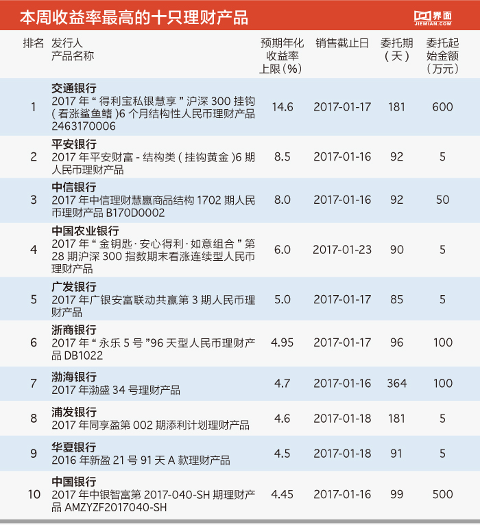 本周收益最高的依然是交通银行2016年“得利宝私银慧享”沪深300挂钩(看涨鲨鱼鳍)6个月结构性人民币理财系列产品。本期新发行的产品与上一期条款相同,收益区间为2%-14.6%,委托期181天,到期日向后顺延一周至2017月7月18日,不保本息。该款产品不单纯看涨沪深300指数,要是到期时沪深300指数小于等于起息日时指数的101%,收益仅为2%;但要是指数涨的太高,曾在委托期间超过了起息日指数10个点,收益便锁定为4.5%;只有当指数在上浮10个点以下的区间波动,到期时收盘价越高收益则越高。投资者在进行此类投资时建议对产品结构以及指数预期进行一定的了解。产品起点为600万元,对于交行的私银客户起点为30万元。