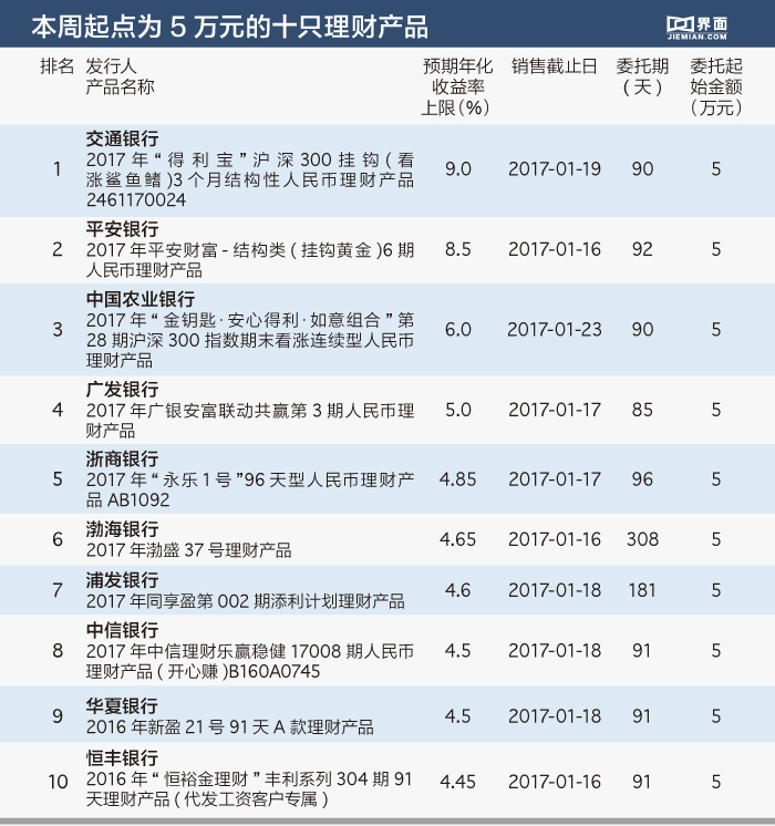 考虑到投资者不同层次需求,本期对起点为5万元的银行理财产品进行筛选,做成榜单,供投资者参考。