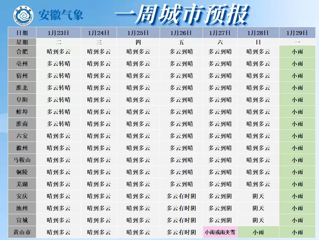 降水:预计23日至26日安徽全省以晴到多云天气为主;27日至28日大别山区和江南有弱降水过程,其他地区天气晴好;29日至2月1日安徽省有持续阴雨雪天气。