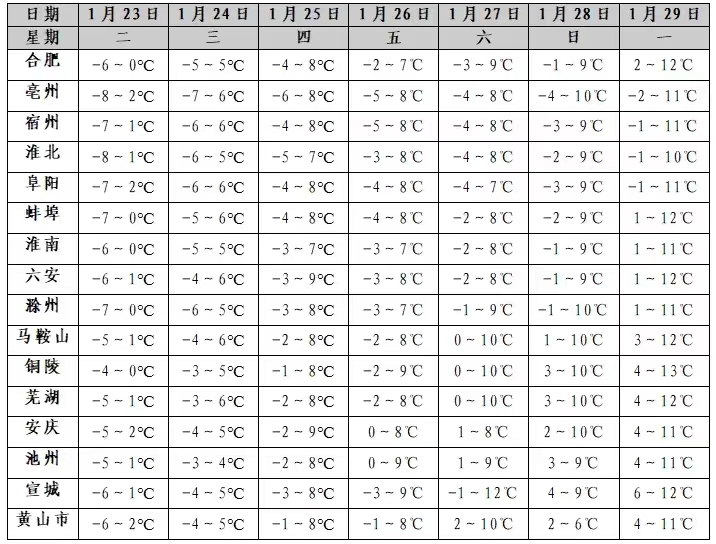 23日最低气温:淮北地区-11~-8℃,最低砀山-11.2℃;淮河以南-9~-6℃。