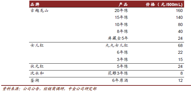 目前,黄酒的主流价格带在 20-40 元——这一价格带目前是白酒行业的“鸡肋价格带”,缺少利润支撑。2013年开始多家黄酒领军企业在高端黄酒领域展开尝试,但是黄酒行业要想真正改变在消费者眼中平民化的形象,让黄酒消费从传统家庭到商务宴请开始转变,还需要提高产品和品牌的附加价值,而这也需要对营销策略进行调整(下图是古越龙山主要产品及价格)。
