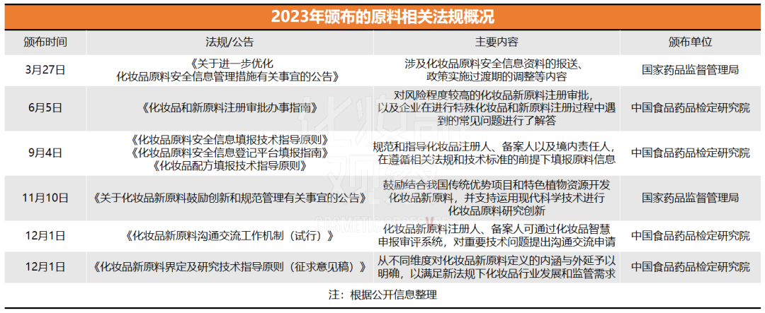 新原料一路狂奔的同时,监管部门也不断出台相关政策,据《化妆品观察》不完全统计,仅2023年就出台了8部原料相关的法规文件。这些创新监管举措,推进化妆品新原料监管工作更细化、更严格、更规范、更完善。