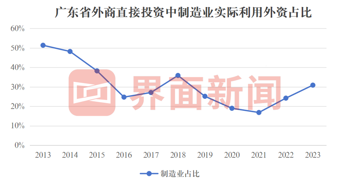 2023年,广东新设制造业外资企业1078家,同比增长29.9%;制造业实际利用外资492.2亿元,同比增长11.7%,占全省实际外资的30.9%。这个比重按年增加6.7个百分点,也是2019年以来制造业占比再次回升到3成以上,创近5年来的新高。